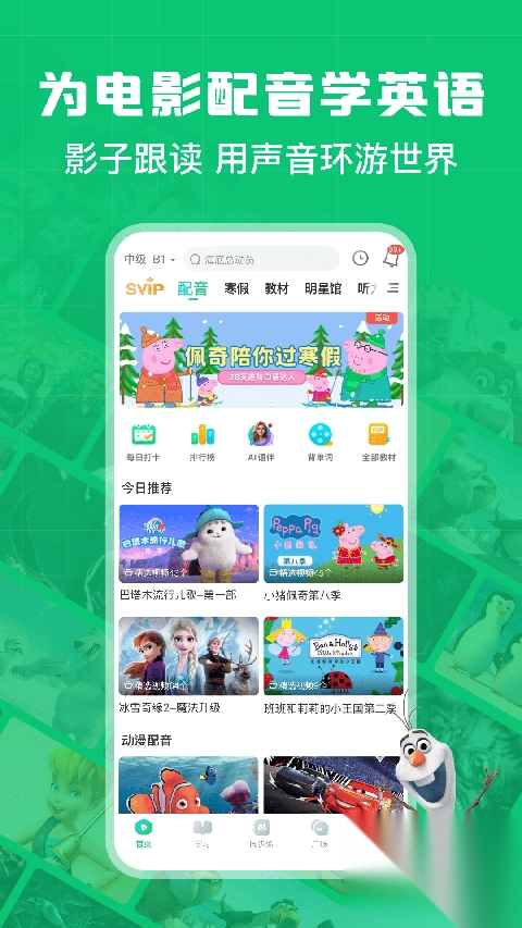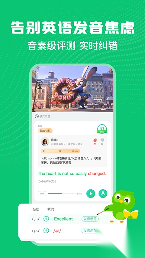 3、体系学:动漫电影专项口语训练,帮助不同语言学习阶段的用户,设计体系化、专业化的学习体验,每天20- 30 分钟,AI智能评估体系,呈现清晰学习报告,实现可视化的语言学习效果。