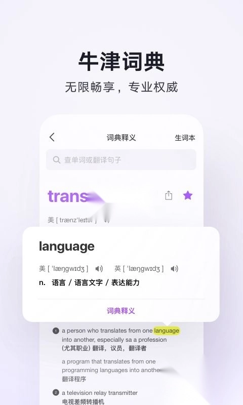 携手牛津大学出版社,依托业界权威词典与海量词汇数据,提供专业的学习释义、例句及词组用法。