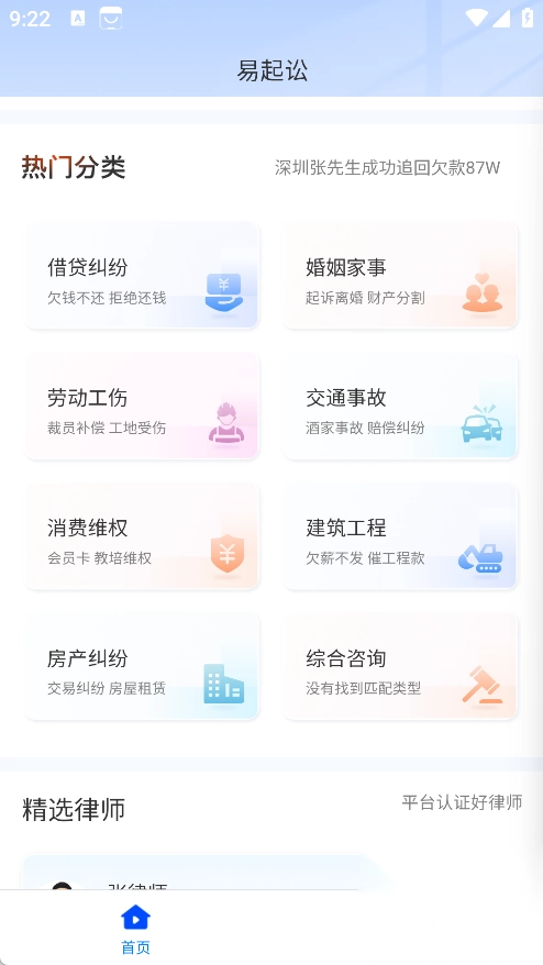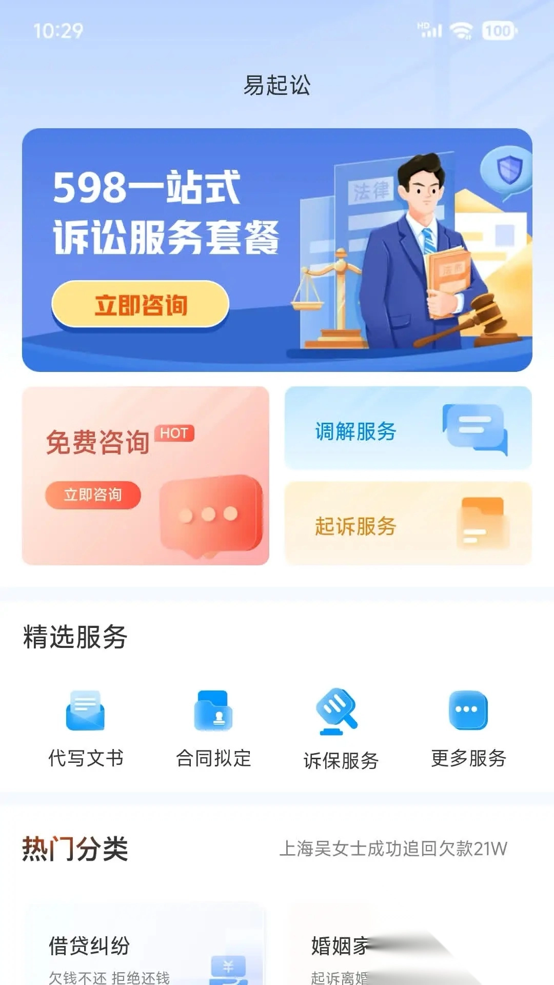 1、首页设有免费咨询、调解服务、起诉服务,同时还有各类精选服务与热门分类等。
