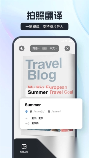 3. 图片翻译:不仅可以上传本地图片交给系统识别翻译,还能使用内建的相机进行实时翻译,非常方便。