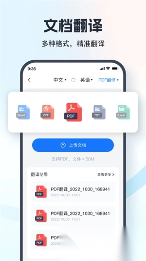 3. 除语音、文本及图片外,用户还可选择上传文件进行翻译。无论是pdf、word亦或是excel等格式,软件均可毫无障碍地完成翻译。