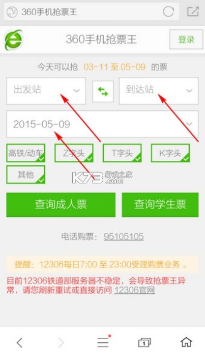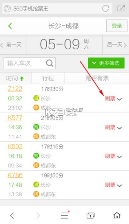 进入360手机浏览器,下滑找到 360手机抢票王点击 立即抢票输入出发、到达站及时间后查询这时会需要登录12306账号登录后出现列车信息,选择需要乘坐的点击 刷票选择席别,点击 开始刷票刷到票后会提示你,这时马上下单就能抢到票了 极为便捷好用。