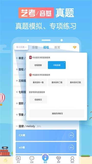 1、练耳:包括单音,音程,三和弦,七和弦等练耳内容。