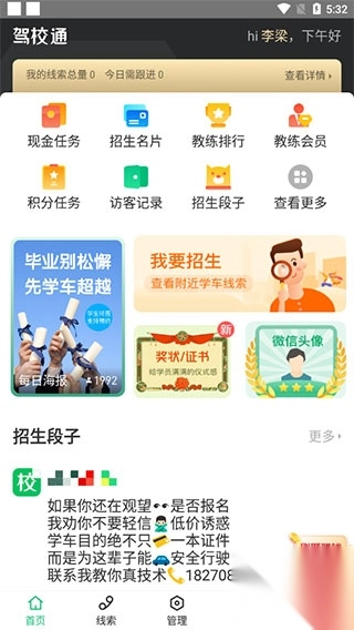 1、下载并进入驾校通,在首页能够看到招生名片、教练会员、招生段子等功能,助力更高效地开展招生工作。
