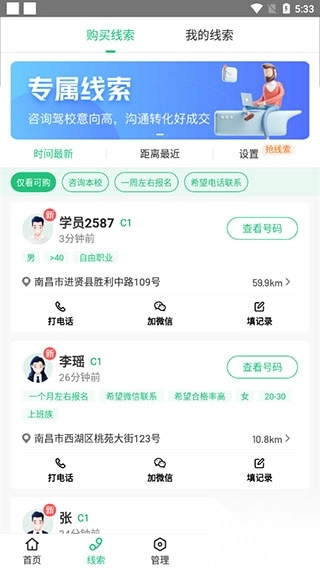 2、在线索页面,可以查看最新学员的报名线索;