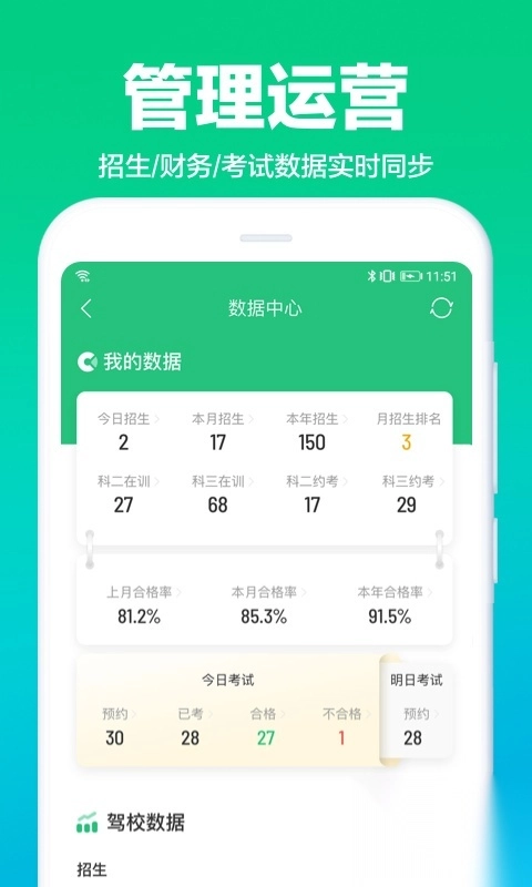 驾校通移动管理,学员档案、招生统计、考试记录、财务报表、员工绩效等实时掌握。