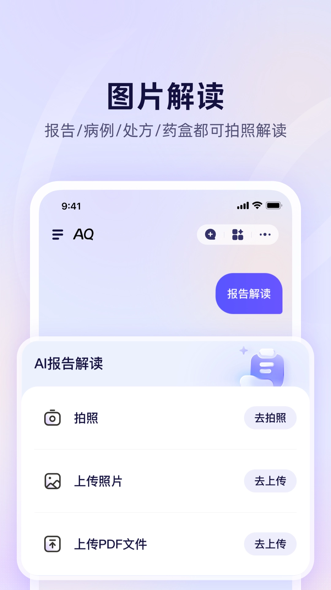 AQ为您提供专业的健康管理服务。在这里,用户能够借助AI更便捷地在线进行健康问诊,获取优质的健康服务,更好地咨询各类健康问题。同时,您还可以在此轻松记录自身健康状况,创建专属电子健康档案,AQ会为您提出科学的健康建议,为您带来全方位便捷的健康管理体验。