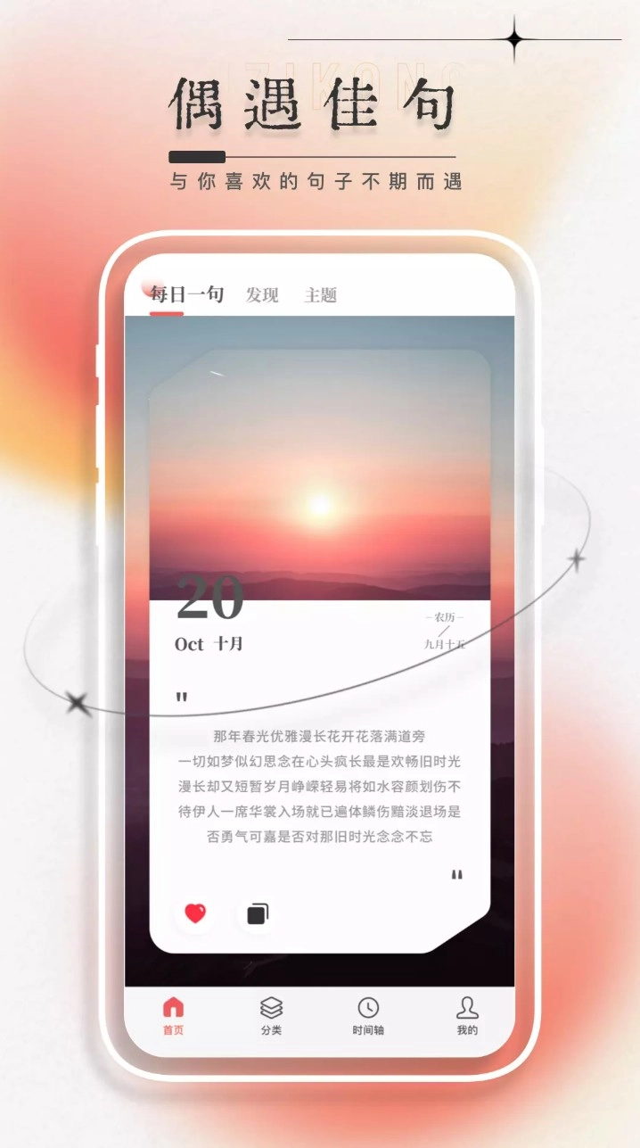1. 进入App首页,可浏览每日推送的精选句子,点击爱心图标可收藏喜欢的文案。
