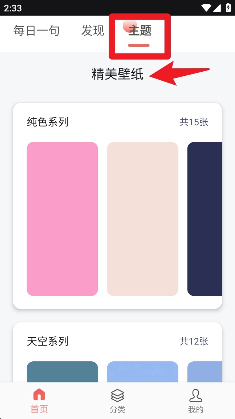 3. 点击上方“主题”进入壁纸主题页面,挑选你喜欢的图案为文案背景。