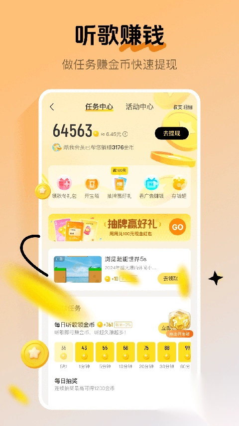 酷我音乐播放器App,是酷我音乐官方精心打造的手机客户端,堪称功能强大的手机音乐播放器软件。在酷我音乐播放器手机版里,海量正版高清音乐与海量音乐词库汇聚一堂,为你带来绝佳的听觉享受。它还支持在线试听与免费下载,让你能更便捷、更迅速地聆听音乐。自2005年创立至今,酷我音乐积累了行业领先的版权曲库与无损音乐库。酷我音乐深度挖掘综艺、影视、剧集等热门内容,借助主播电台、音乐直播、视频等特色板块,搭配国际前沿的音频技术以及高性价比的音乐硬件产品,始终致力于为用户打造个性化、多元化的音乐体验。此外,酷我音乐播放器手机版支持跨平台无缝同步。快来把好音乐装进你的口袋,随时随地,想听就听。