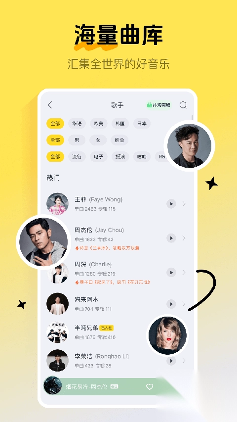 千万量级正版高品曲库,包含周杰伦、林俊杰、张学友、Taylor Swift、BLACKPINK、Seventeen等歌手的歌曲,可无限畅听。