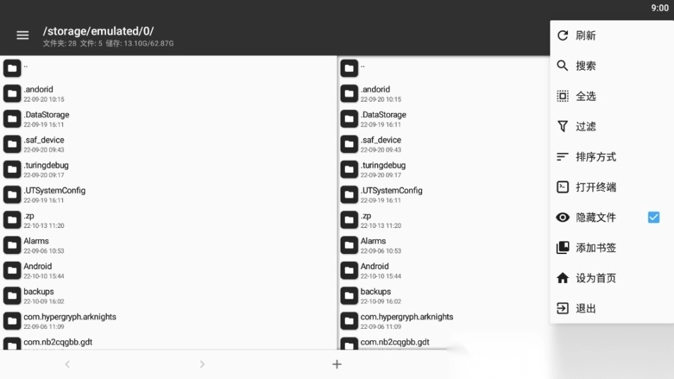双窗口操作打开 MT 管理器后第一眼看到的就是它的左右两个操作窗口,该设计已经是 MT 的标志之一,与之对应的是双窗口操作模式。