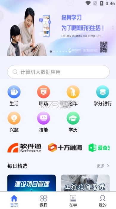 国开终身教育平台app,作为国家开放大学倾力打造的线上学习软件,所覆盖的学习知识面极为广泛。无论是学习领域,还是日常生活,亦或是职场范畴,都考虑得面面俱到。平台上有着海量优质课程供用户在线免费学习,而且用户之间还能相互交流,为广大用户提供优质的学习服务。国家终身教育平台App主打开放大学的教育软件,是一个全新的学习平台,涵盖生活、兴趣、职场等各类免费课程。用户能够在线自主挑选课程,同时平台设有新课程分类以及优质课程推荐。感兴趣的朋友们,赶快下载体验吧!