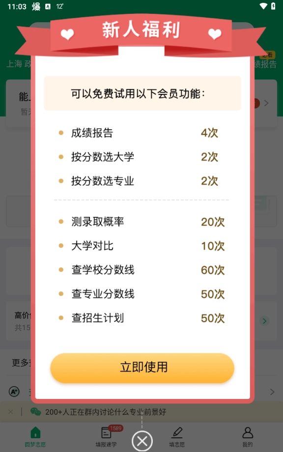 1、首先在本战下载安装该app并打开登录,进入圆梦志愿页面后点击搜索框下方的改分。