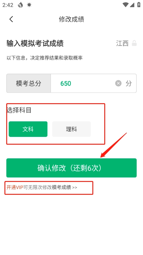 2、然后在修改成绩的页面可以看到科目的选择,改为你想要的科目点击确认修改即可。注意免费修改机会只有6次,但是开通vip可无限次修改科目和模拟考成绩。