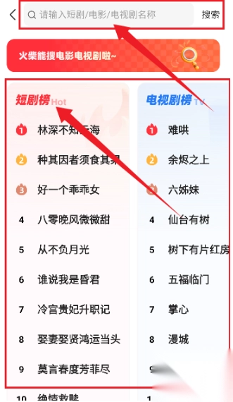 4、你也可以在顶部搜索框输入剧名,进行精准搜索。此外,还能查看平台的搜索榜单,让你轻松掌握全网的追剧动态。