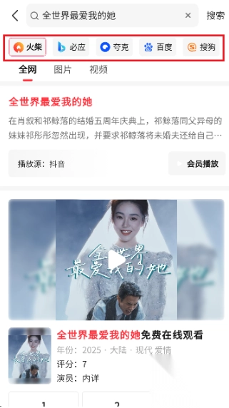 5、挑选一部短剧进行搜索,能够看到来自全网所有平台以及各个搜索引擎的相关资源。