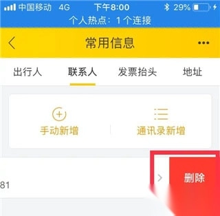 4、在需要删除的乘客条目位置向左滑,点“删除”按钮,即可删除乘客信息。