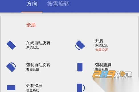 2)强制自动旋转、强制纵向、强制横向、反转纵向、反转横向、传感器纵向、传感器横向。