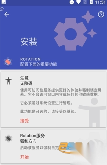 4、举例来说,若你打算借助Rotation软件实现强制横屏操作,那就先点击“强制横屏”,接着再点击“开始”。