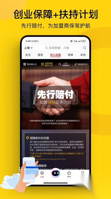 全球加盟网,堪称一款极为实用的品牌加盟平台。于此处,用户能够挑选自己心仪的品牌加盟,平台还提供一对一专业服务,全力打造双向价值共赢的平台。平台借助品牌评估师实地考察、深度调研,切实保障项目的真实性,帮您剖析验证品牌的盈利能力,为客户大幅减少决策时间与决策风险,提升创业质量。同时,平台拥有认证的《盟信通》助力加盟,为您带来更优的创业体验,实现无忧创业。此外,平台支持全城人气商铺、商场入驻,且支持区域、行业、商铺门面类型、面积、装修风格、租金、商铺租售转让等多维度筛选,方便管理,助力创业者一站式快速对接创业开店的商铺需求,塑造出一个更为快捷高效、更为优质的平台。有需求的朋友不妨前来下载体验一番!