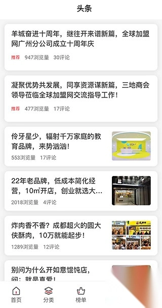 3、在【榜单】页面,我们还可看到不同分类的加盟排行榜,像今日推荐、餐饮美食、家居建材等。