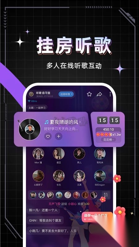 3、挂房听歌:多人在线听歌互动,各种主题听歌房间全天开放