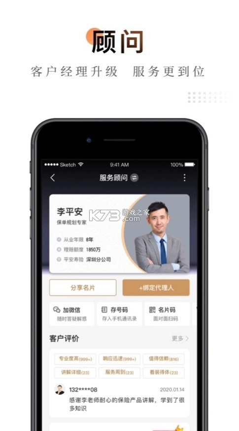 “平安金管家”,为你带来精选保险理财产品与专业金融服务,全方位满足用户金融服务需求。不仅如此,还有多种活动豪礼等你领取。平安金管家 APP 注册量已突破 1 亿用户。它是中国平安人寿保险推出的移动生活金融管家,能为用户提供保险保单、财富增值、丰富活动以及健康管理等全方位移动金融生活服务。 平安金管家先后融入健康管理、保单服务、金融理财、生活助手等全面的金融服务功能。借助这些功能,用户可轻松管理与查询保单信息,进行线上投保以及咨询问题,资金账户管理也更为便捷,随时随地购买心仪理财产品。其独特的健康生活板块,让用户享受全面的医疗健康服务,家庭医生随时问诊,健康资讯即时接收,健康习惯随时管理。