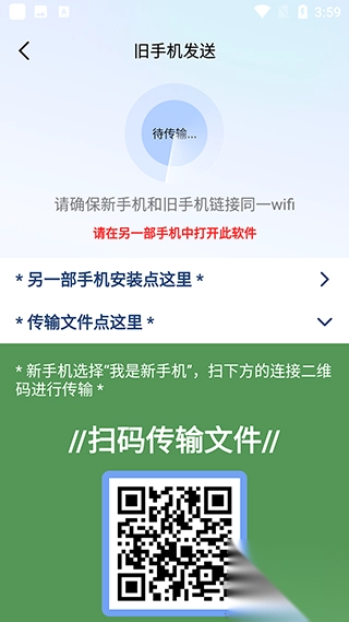 4、新手机安装换机助手后,点击 “我是新手机”,扫描二维码,等待文件传输完成。