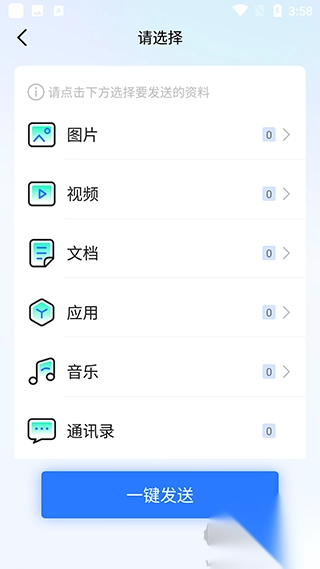 3、勾选图片、视频、文件、应用等,点击 “一键发送” 确认传输内容。