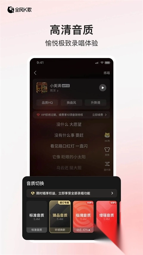 - 录歌新体验:KTV模式全面升级,进入全屏MV界面,搭配超大字体歌词,让你唱歌的快感直线飙升!