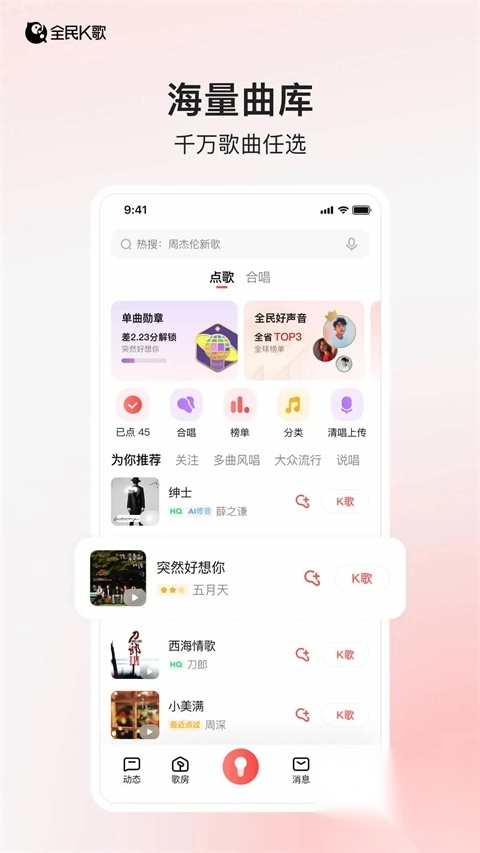 音乐,几乎是人人都钟情聆听的存在,它宛如一股清泉,为我们带来纯粹的愉悦,给予快乐的享受。想必你也时常会不自觉地哼上几句吧,即便唱功欠佳,可这丝毫无法阻挡我们对音乐的热爱!当意识到自己唱歌水平有待提高时,内心是不是瞬间涌起一股强烈的冲动,渴望把歌唱好呢?那就来全民K歌ios版!全民K歌要告诉你,哪怕你五音不全,在这里也能尽情欢唱!这里汇聚了超多与你志趣相投的歌友,海量的歌曲任你挑选练习。用歌声倾诉内心的情感,用歌声展现你坚韧的意志,用歌声喊出你不羁的狂野个性!快来全民K歌,练就美妙歌声,证明自己同样是唱歌达人!