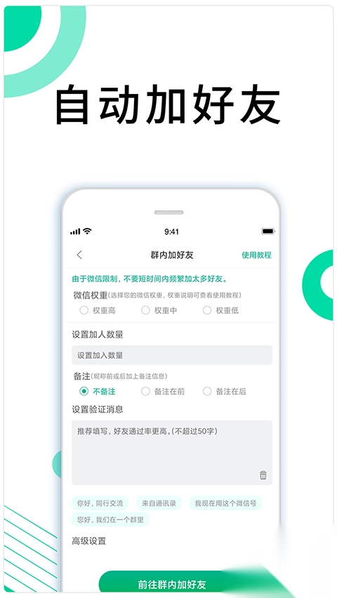 自主设定验证信息、加人时间间隔以及加人起始位置,逼真模拟人工操作流程,达成快速大量增加粉丝的效果。