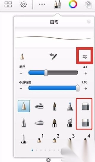 1、橡皮擦位于笔的标志之中,在此处能够选择画笔、橡皮擦,还能调整透明度大小与半径大小。