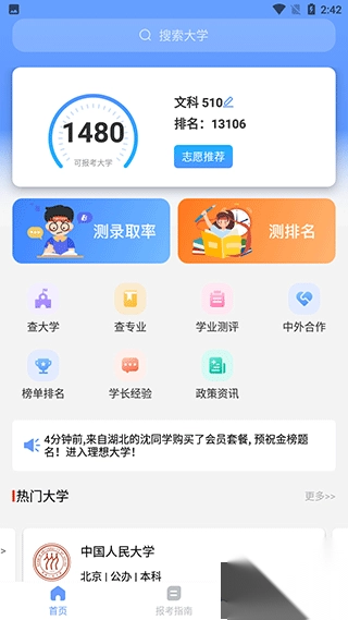 二、待信息完善后我可以看到成绩的排名、可报考大学数量和志愿推荐。