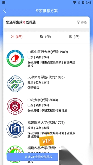三、点击志愿推荐,系统会依据你的成绩,自动将志愿划分为保、稳、冲三种类型,让你能直观知晓可被录取的学校。
