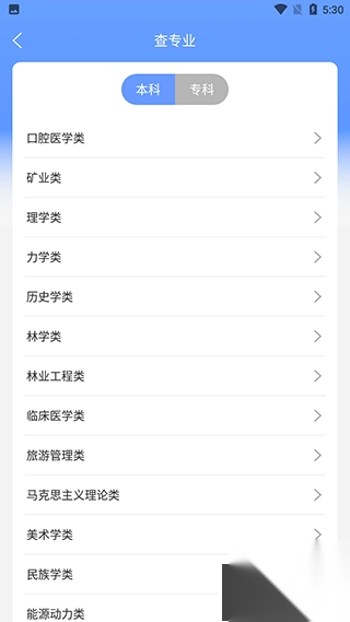 五、点击“查专业”功能,其中涵盖专科、本科的各类专业类型。用户点击心仪的专业,便能详细了解该专业的介绍、招生院校以及就业前景。