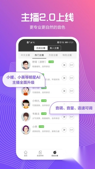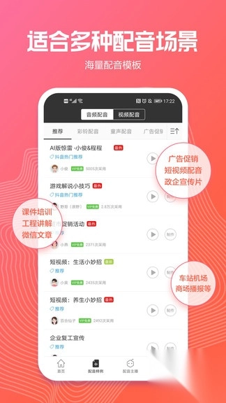 提供商业广告配音、政企宣传片配音、彩铃配音等多种tts配音场景模板。