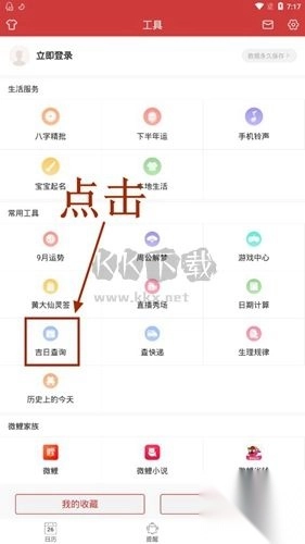 第一步,打开软件,接着点击软件底部的【工具】功能分区,进入工具界面。在该界面中,能看到“吉日查询”,然后点击此“吉日查询”。
