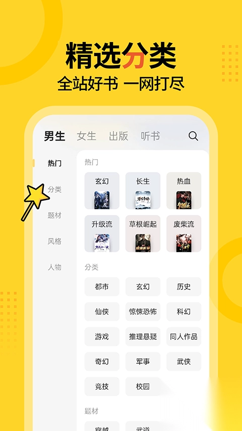 3、全面的小说类型:玄幻、都市、言情、武侠、科幻、军事、职场励志,应有尽有。