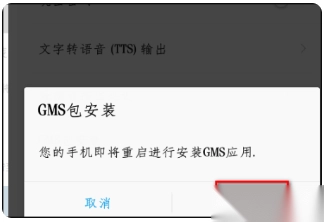 3、弹出安装提示,确认安装相关事项后,系统会自动开启GMS安装流程,安装结束后手机将重启。