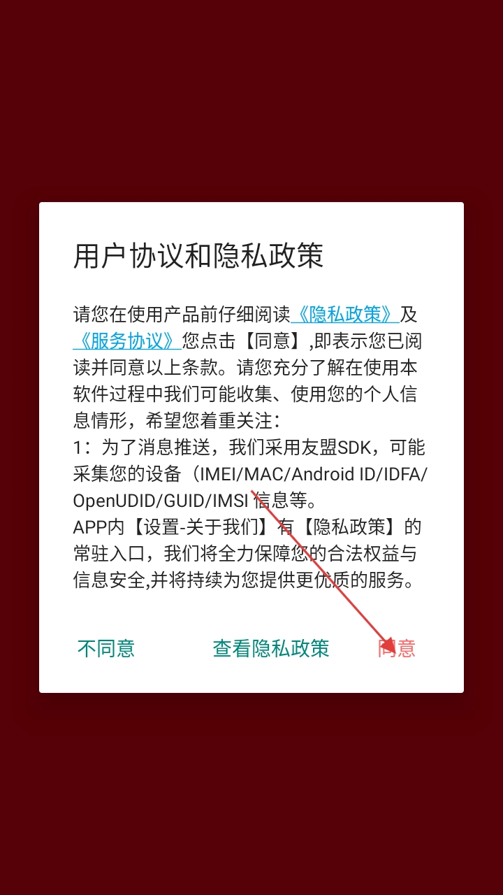 1、阅读用户协议和隐私政策,点击【同意】,进入登录界面。