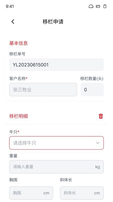2. 开展移栏申请时,能够自行定义编辑移栏单号、客户名称、牛只及重量等相关信息,随后提交申请。