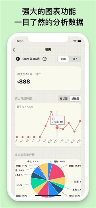 6. 能够在柱状图和折线图间相互切换,以此直观洞察自身消费行为及趋势。