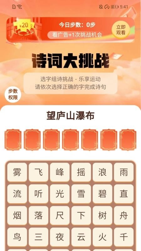 乐享计步宝APP最新版,是一款融合运动、诗词大挑战与赚钱功能于一身的软件。在软件里开通步数权限后,就能实时记录用户每日的运动步数。完成每日步数任务,可获得丰厚运动奖励。软件还推出每日任务,用户通过做任务能赚取红包奖励,任务丰富,奖励多多,有助于用户积累更多红包收益。用户随时可将赚取的收益提现使用。此外,用户参与诗词大挑战也能获取红包奖励,从系统给出的汉字中选字组成完整诗句来答题,在答题赚钱过程中,既能考验诗词储备,又能增添学习乐趣。有需求的用户,快来下载乐享计步宝免费版体验吧!