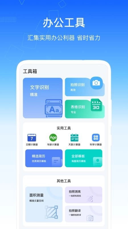 软件内配备了实用的办公工具,于工具箱里能够看到文字识别、拍照识别以及测量工具等。