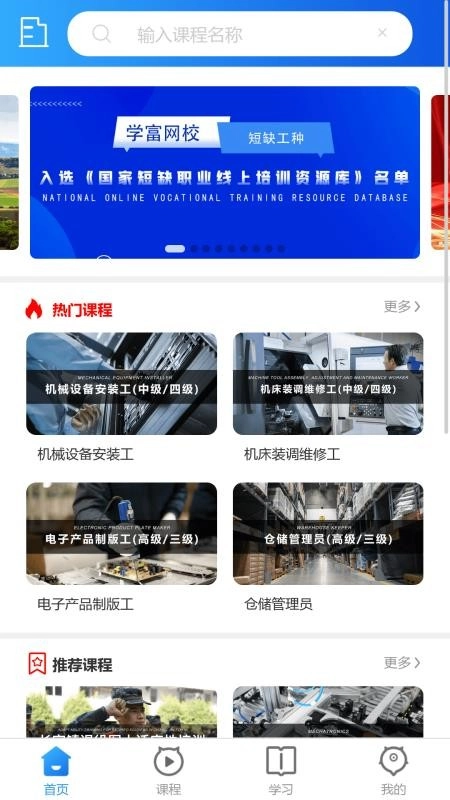 1. 在学富网校APP的首页,你会看到许多热门推荐课程,可随意挑选进行学习。