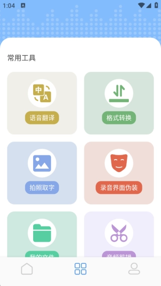 2. 常用工具页面设有语音翻译、格式转换、拍照取字、录音界面伪装、我的文件、音频剪辑等板块。