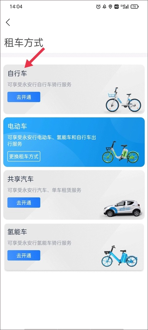 3、选中自行车选项,点击“去开通”按钮,依照流程完成开通步骤,就能畅享永安行自行车骑行服务,开启绿色出行之旅。
