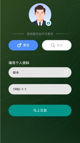 3、选择性别,填写个人资料,就可以进入到交友界面,让你随时都可以高效去聊天。